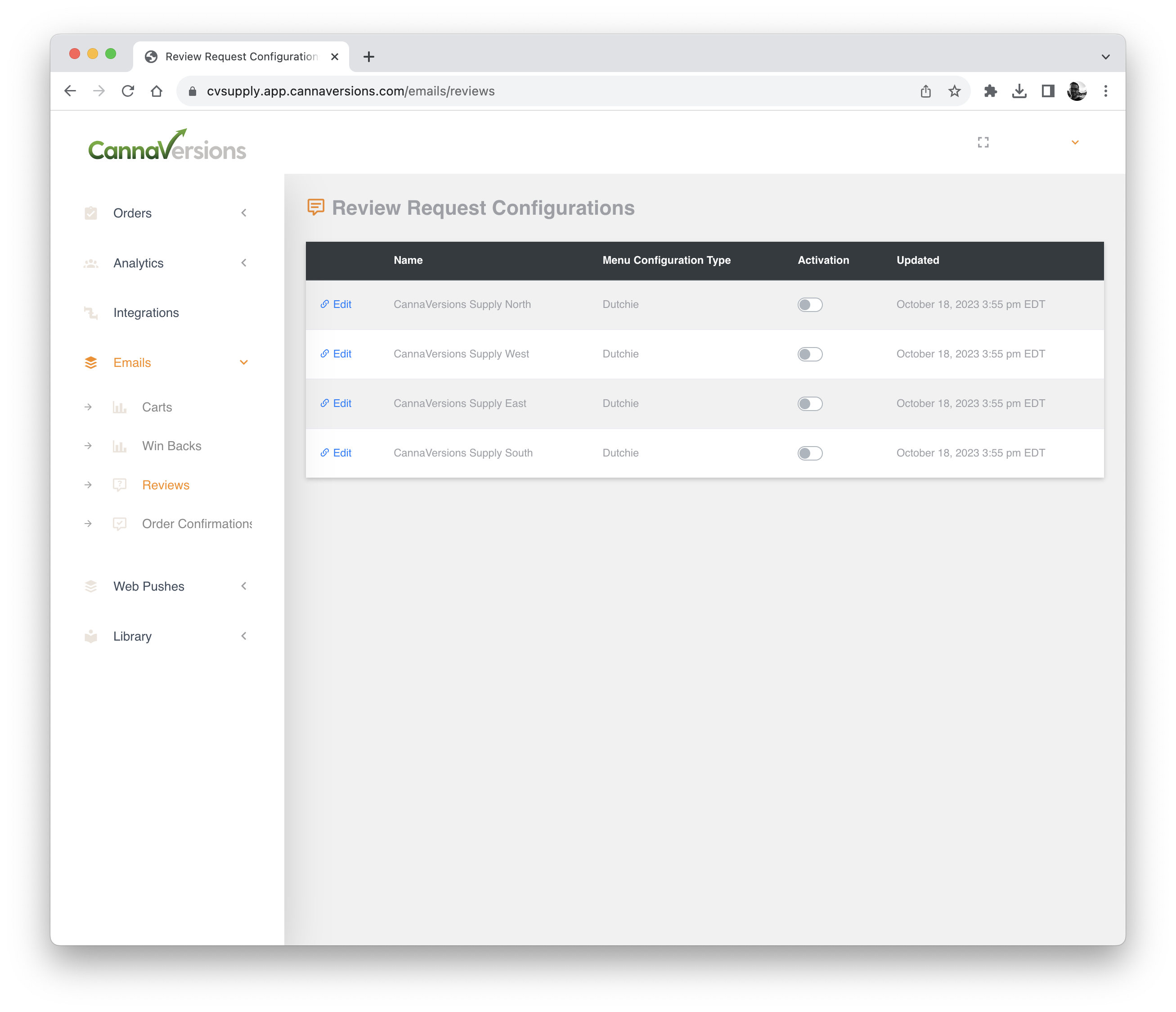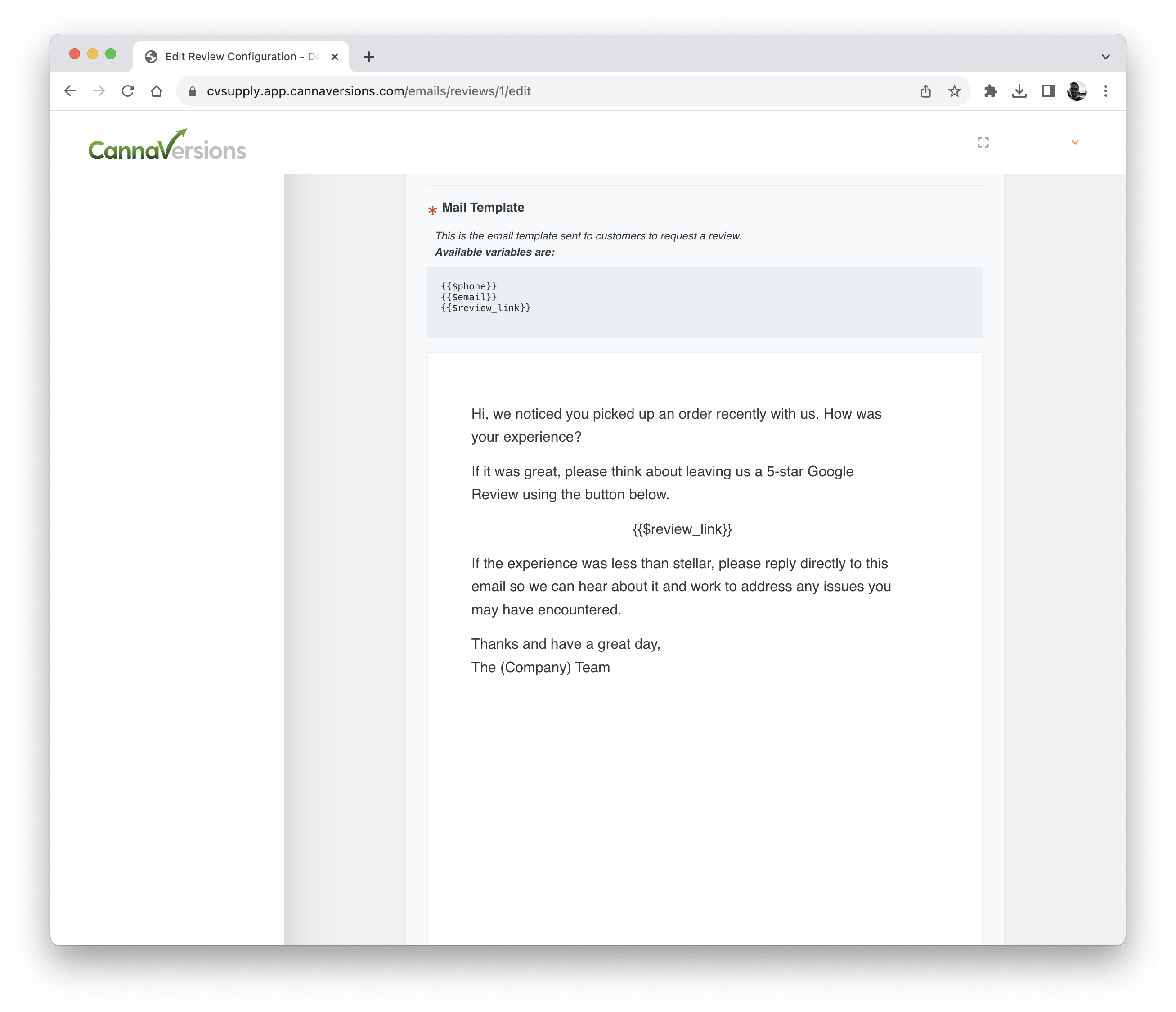 Currently email settings are set for each location individually. If all of your emails templates follow the same rules and contain similarly formatted content regardless of location, you’ll need to copy and paste the information into each location’s email template. Alternatively, you can complete one template and then notify your CannaVersions team member who can copy them for you.
