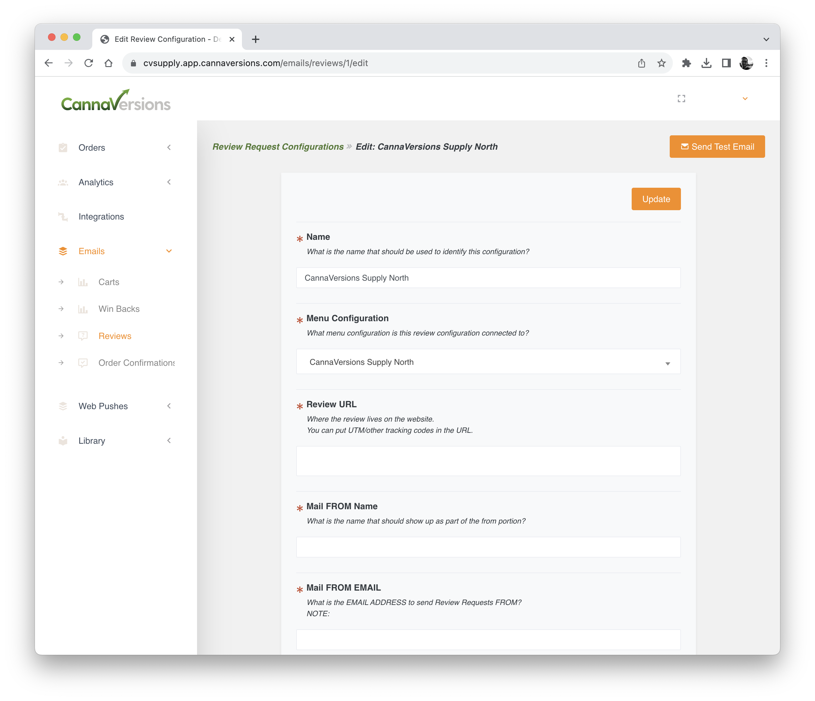 Send yourself a test by clicking the send test email button in the upper right hand corner. Once you’re happy with your email template, notify your CannaVersions team member or email [email protected] and give us the go ahead to set the email flow live.