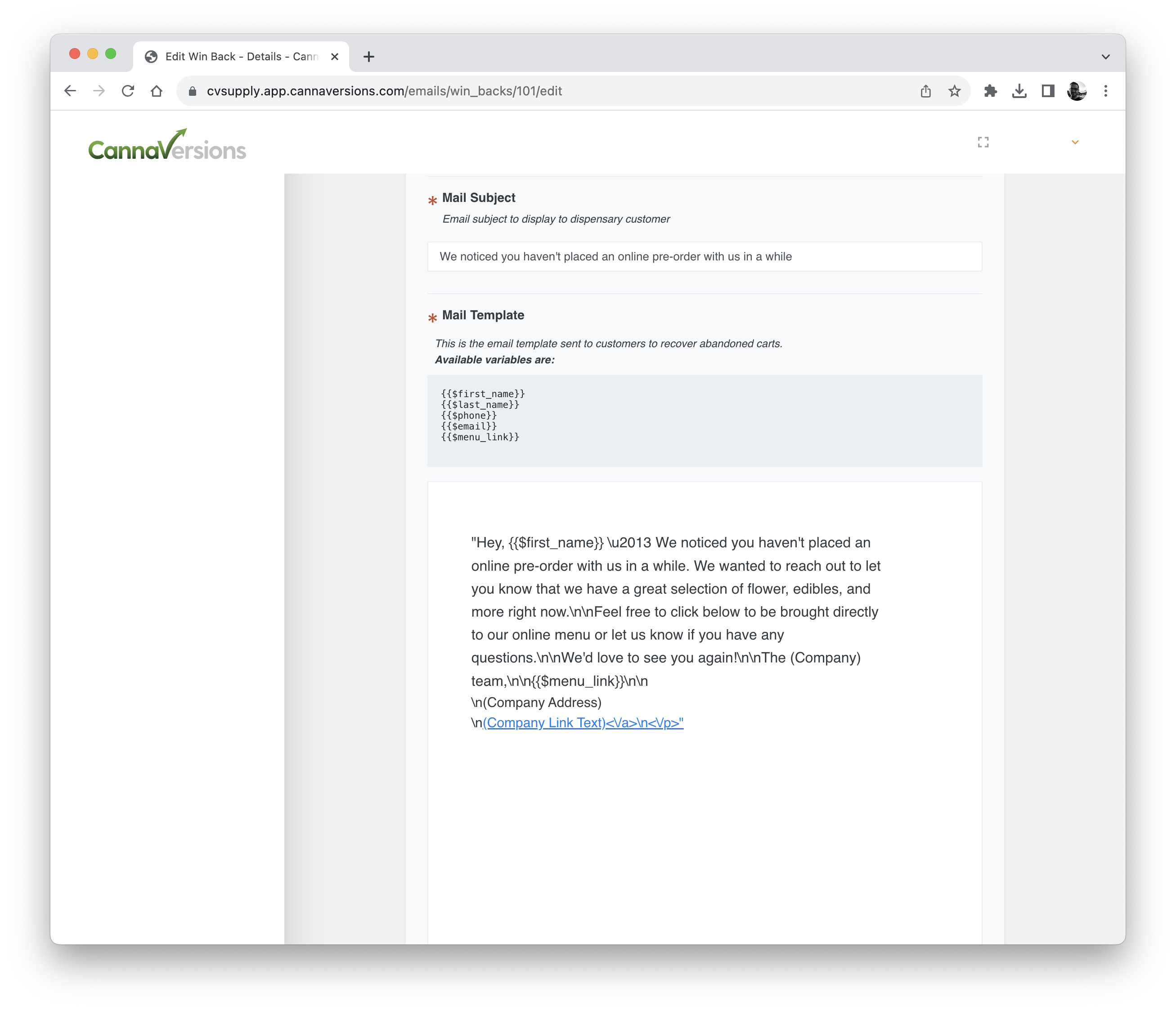 The following instructions show you how to setup and edit the content for your email template to be used to win back customers with a timely, personalized message.