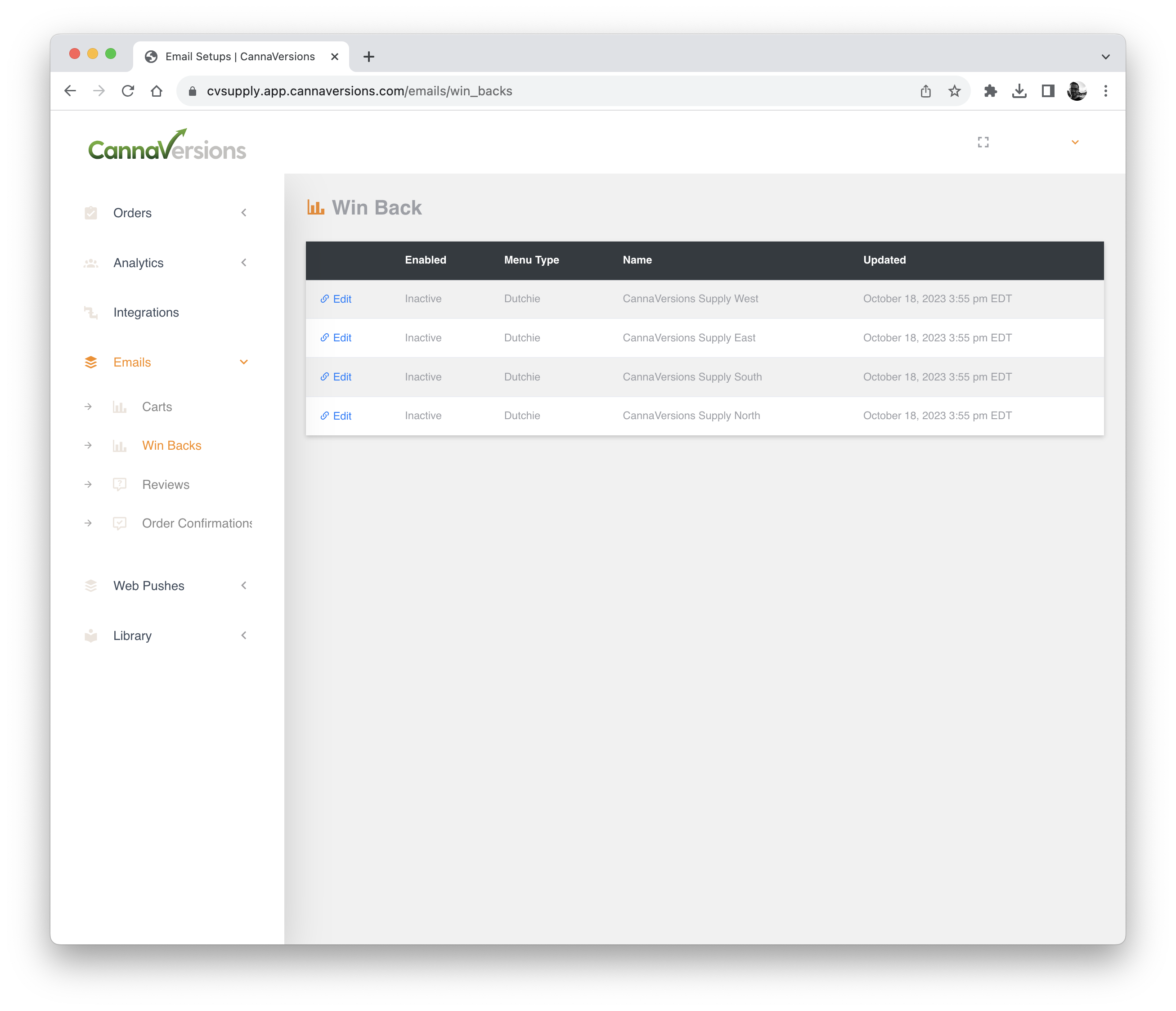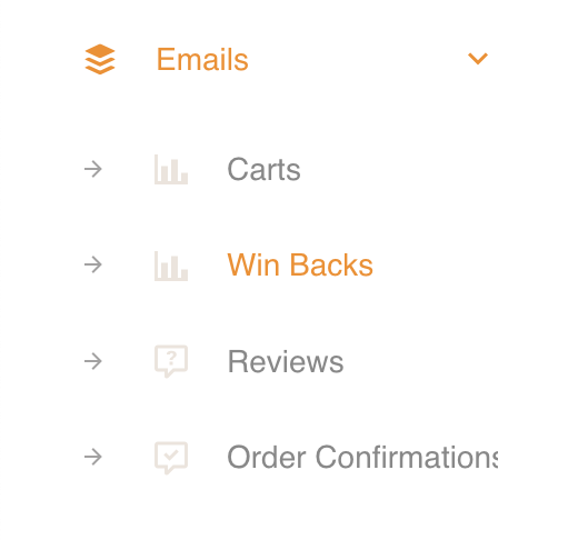On the left navigation, click EMAILS and then select which email flow you wish to edit. In this case, you’ll select Winbacks.